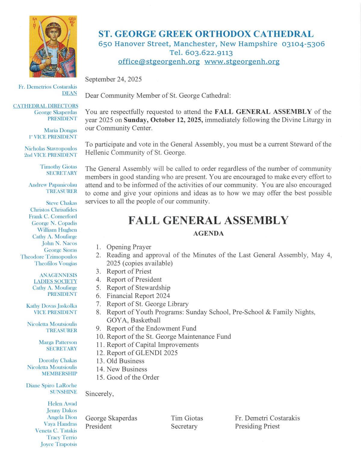 You are respectfully requested to attend the Fall General Assembly 2023 on Sunday October 15, 2023 immediately following Church Services. Click below to view/print the Agenda.