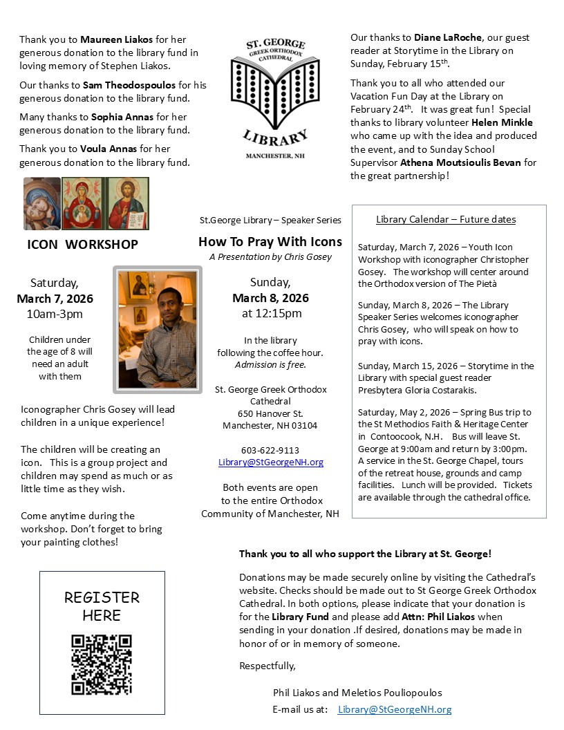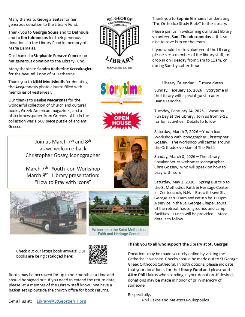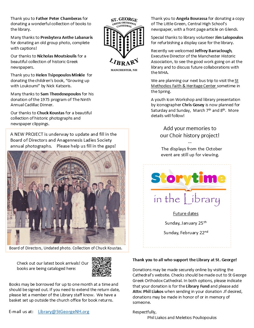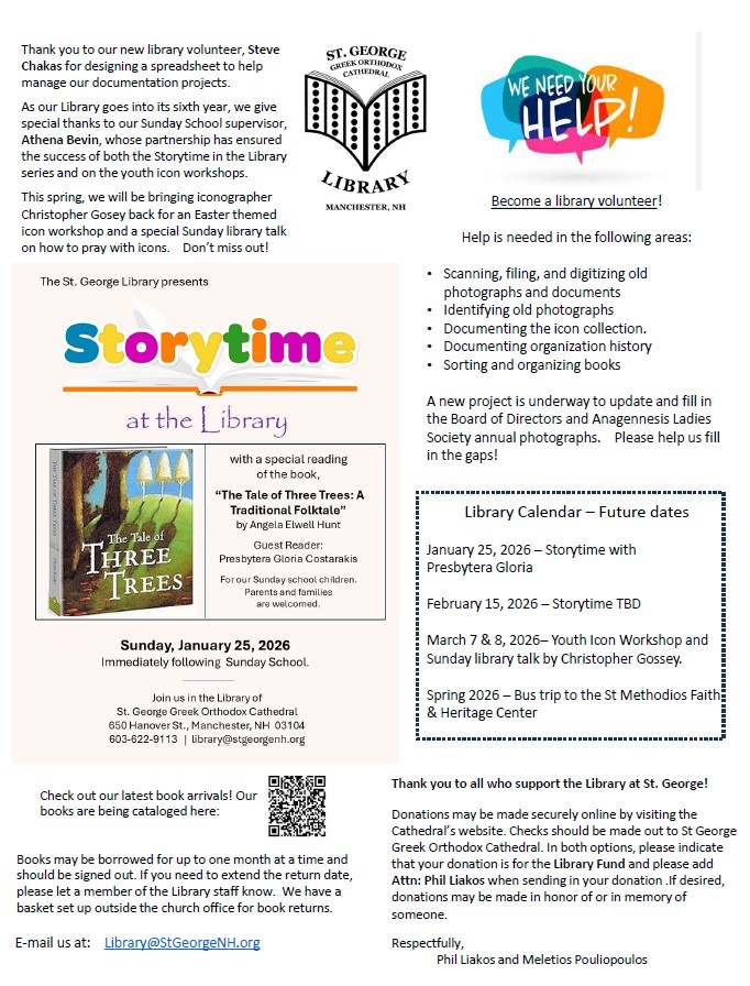 We are grateful for the continued support received from our beloved St. George Cathedral family! Library improvements this year included: 18 new conference table chairs, a new entrance sign, a display bookcase, a cabinet and speaker stands for the PA system, a portable power station, a laptop stand, a colorful rug and books for our Storytime events, a framed Time magazine photo of Archbishop Iakovos and MLK, and the addition of several new books.